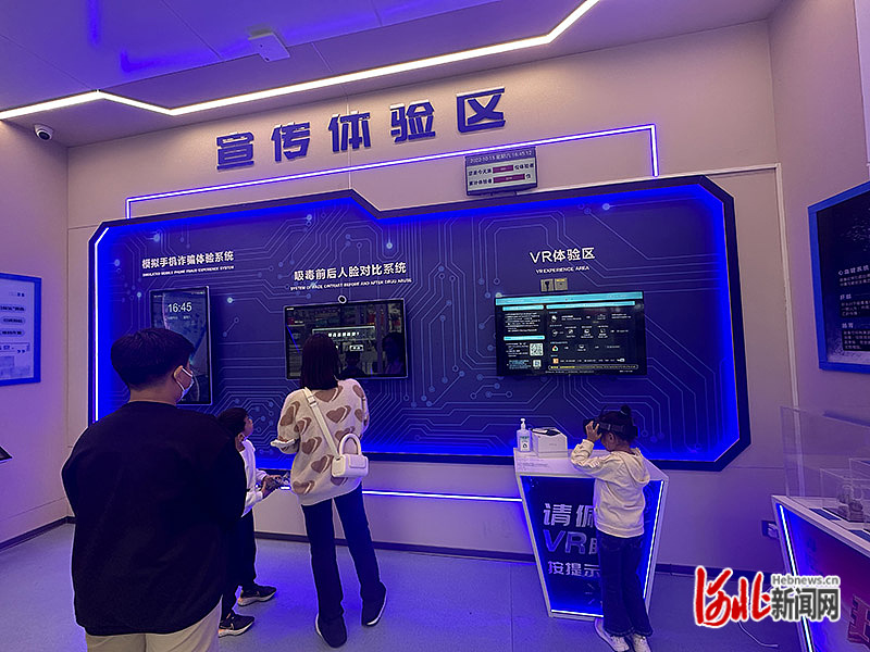 走進(jìn)宣傳體驗(yàn)區(qū),里面已經(jīng)有七八位市民正在體驗(yàn)。記者看到,宣傳區(qū)里設(shè)有個(gè)人信息途徑泄露認(rèn)知系統(tǒng)、模擬手機(jī)詐騙體驗(yàn)系統(tǒng)、吸毒前后人臉對(duì)比系統(tǒng)、VR體驗(yàn)區(qū)和毒品模型展示板塊。在VR體驗(yàn)區(qū),記者親身體驗(yàn)了家庭失火逃生模擬。帶上VR眼鏡,一間燃著熊熊大火的房子突然出現(xiàn),讓人身臨其境。按著逃生提示指引,記者一步步選擇正確的逃生路線,完成逃生體驗(yàn),“實(shí)戰(zhàn)”掌握了火場(chǎng)逃生技能。