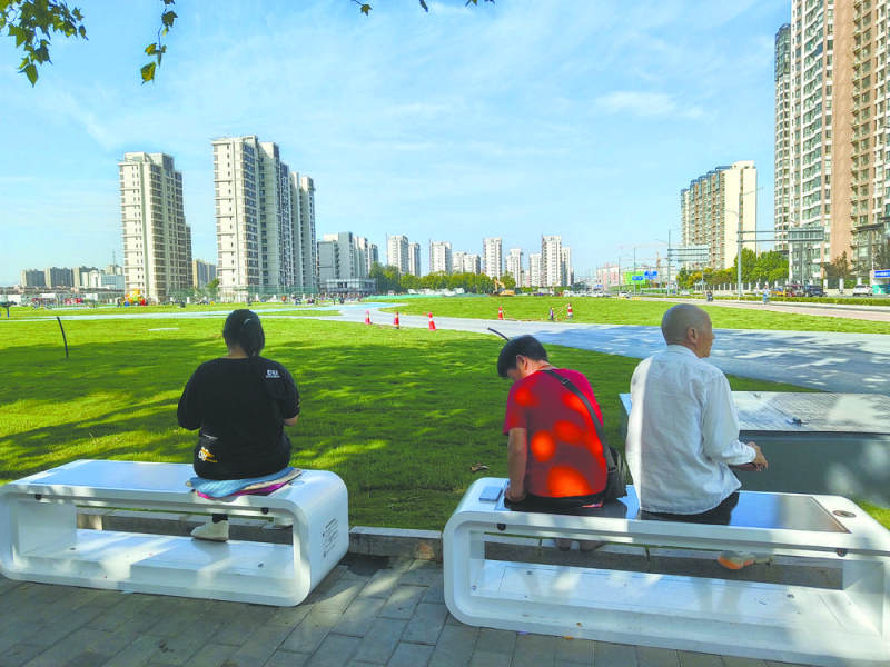 9月18日9時30分許,記者來到了中華大街與豐收西路交叉口的西南角,旁邊正在建設(shè)一座公園——“中華園”,便道上設(shè)置了3個智慧座椅,顏色為白色,長方體中空設(shè)計,有市民正坐在上面休息。座椅上方可以看到一大塊黑色的太陽能板,在這塊太陽能板的兩側(cè)都有一處無線充電板。市民李先生將手機放在面板上,手機屏幕上很快就出現(xiàn):“正在無線充電”的字樣!疤呖萍剂耍∵@旁邊就是正在建設(shè)的一座公園,玩累了,到這兒休息,手機沒電了還能無線充電,咱石家莊真是越來越有現(xiàn)代感,越來越親民了!”李先生開心地說。