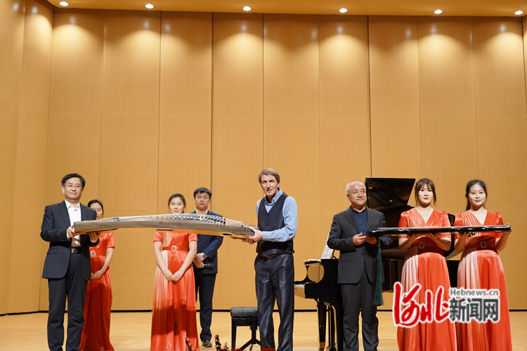 演出最后,石家莊學(xué)院黨委書(shū)記陳亮、樂(lè)達(dá)國(guó)際藝術(shù)學(xué)院院長(zhǎng)郝志明為Elio Orio教授送上代表中國(guó)特色的傳統(tǒng)民族樂(lè)器——古箏、古琴,祝愿兩校友誼長(zhǎng)存、共譜合作新篇章。