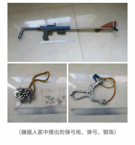 經(jīng)過辦案民警大量調(diào)查和分析研判,鎖定該社區(qū)對面某樓的陳某具有重大作案嫌疑。近日,民警果斷出擊,將犯罪嫌疑人陳某在家中抓獲,當場搜查出彈弓槍1把、彈弓5把、鋼珠385顆、彈弓皮條40條。