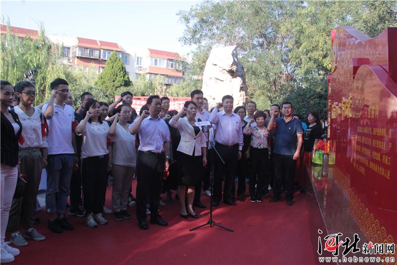 9月25日,唐山祥富里社區(qū)舉辦廣場舞大賽暨黨員進(jìn)社區(qū)主題活動。圖為社區(qū)黨員重溫入黨誓詞。