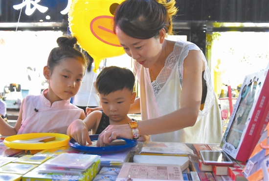 7月20日,河北省唐山市豐潤(rùn)區(qū)中嘉大道夜間市場(chǎng)內(nèi),小朋友在家長(zhǎng)的陪同下選購(gòu)益智玩具。