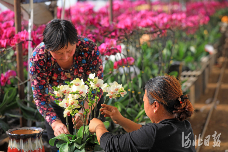 2021年2月1日,工人在河北省唐山市灤南縣宋道口鎮(zhèn)東清水村蝴蝶蘭種植基地溫室大棚里組裝蝴蝶蘭盆花。春節(jié)臨近,該基地20多個(gè)品種、3萬多盆蝴蝶蘭進(jìn)入盛花期,花農(nóng)忙著組裝盆花外運(yùn)銷售,滿足春節(jié)市場(chǎng)需求。 通訊員 張永新攝影報(bào)道