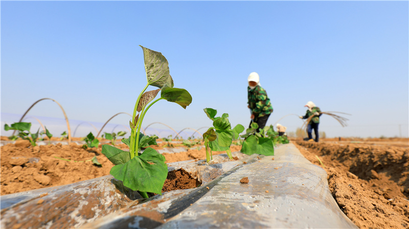 4月6日,唐山市灤南縣東黃坨鎮(zhèn)新戶村農(nóng)民采用雙層覆膜技術(shù)種植紅薯。