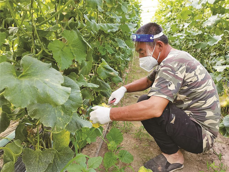 圖為毛莊鎮(zhèn)公官營北村農(nóng)民在做好個(gè)人防護(hù)的前提下,正在采摘甜瓜。 顏澤攝