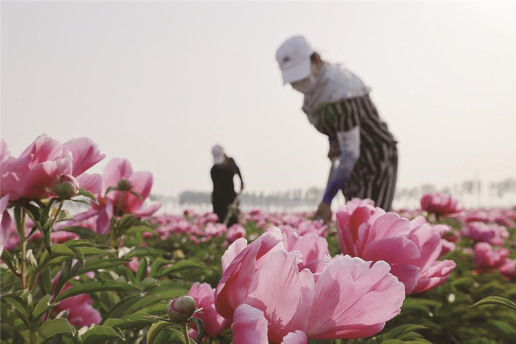 農(nóng)忙時節(jié),各地農(nóng)民搶抓農(nóng)時進行勞作,田間地頭一派繁忙景象。圖為河北省唐山市豐南區(qū)東田莊鄉(xiāng)南元莊村的農(nóng)戶在芍藥花田中勞作。 新華社發(fā)(李秀清 攝)