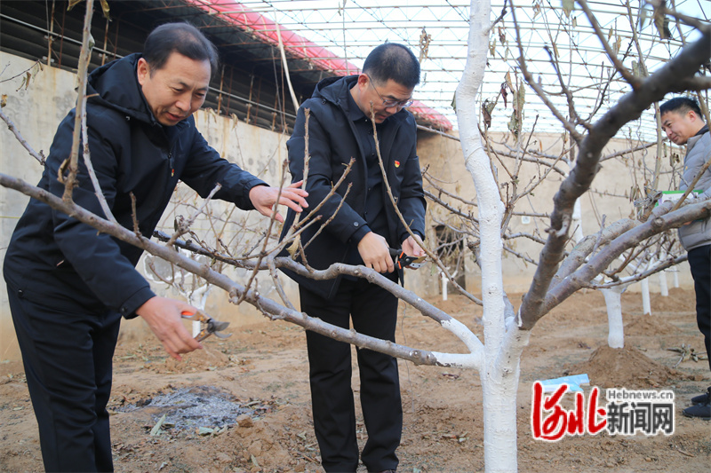 圖為駐村工作隊(duì)隊(duì)員在幫助果農(nóng)修剪棚室果木。通訊員吳海民攝