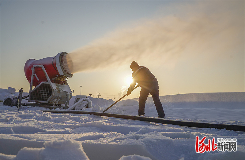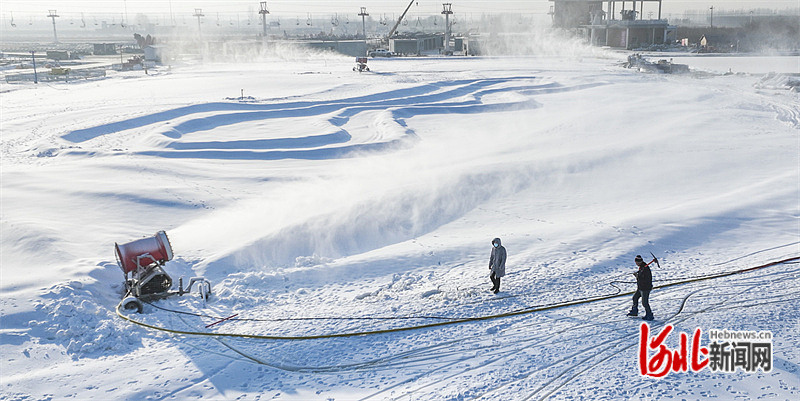 12月28日,工人在河北省遵化市團(tuán)瓢莊鎮(zhèn)山里各莊田園綜合體景區(qū)造雪。