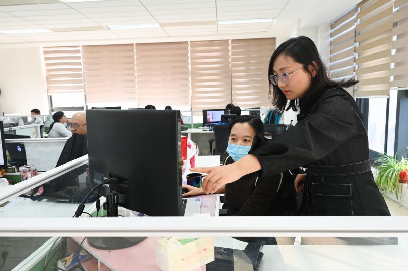 圖為11月6日,唐山啟奧科技股份有限公司董事會秘書楊曉麗與同事交流工作。郭寶強攝