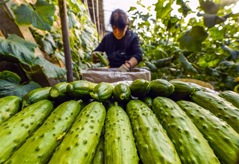 2月7日,河北省遵化市東新莊鎮(zhèn)南崗村農(nóng)民在收獲黃瓜。