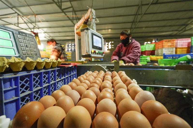 2月7日,河北省遵化市東新莊鎮(zhèn)一家蛋雞養(yǎng)殖場的工人在整理裝箱的雞蛋,準(zhǔn)備外運(yùn)。