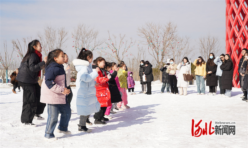 圖為大學生在唐山花海冰雪樂園與小朋友們一起嬉戲。