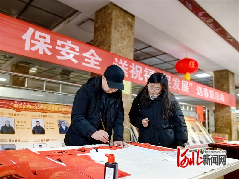 圖為活動現(xiàn)場,書法愛好者現(xiàn)場為員工寫春聯(lián)。