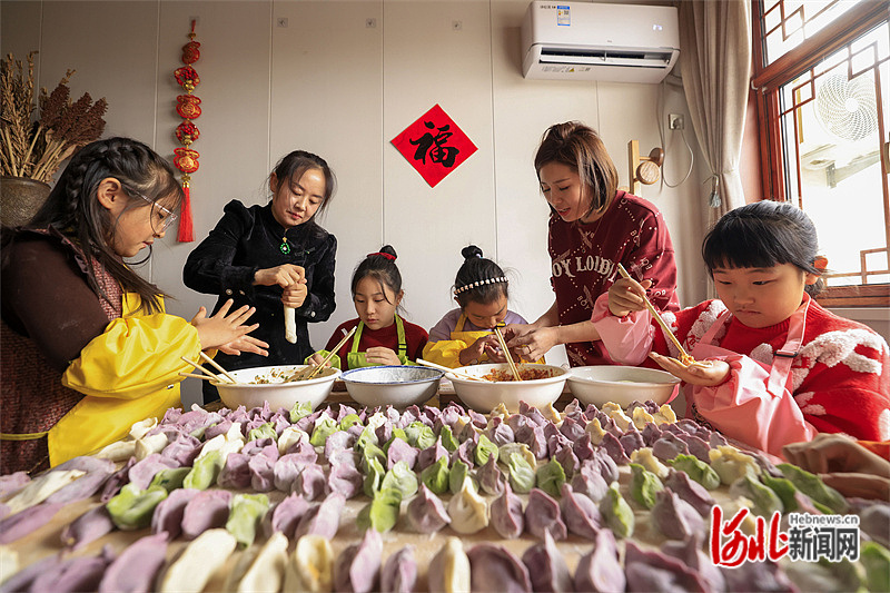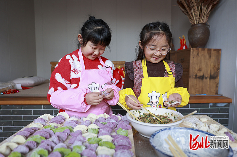 唐山市豐南區(qū)胥各莊鎮(zhèn)蠻子坨村村民小朋友在包餃子。