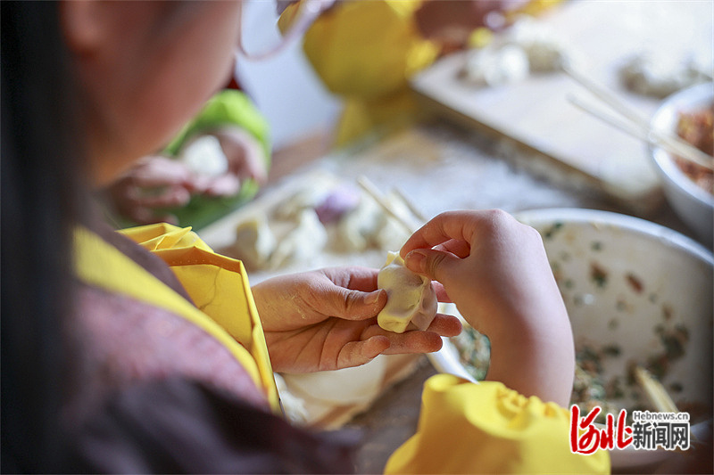 唐山市豐南區(qū)胥各莊鎮(zhèn)蠻子坨村小朋友在包餃子。