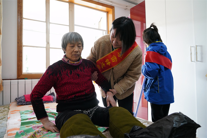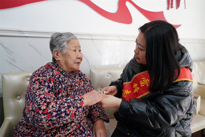 圖為唐山市開平區(qū)馬家溝街道新華社區(qū)志愿者走進養(yǎng)老院,為老人剪指甲,陪老人聊天。