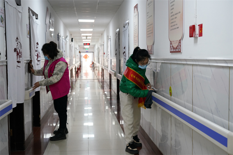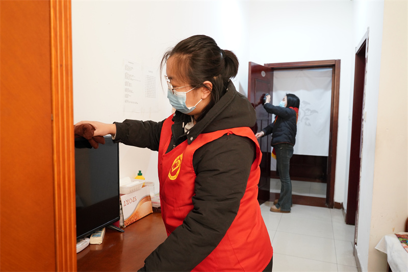 圖為社區(qū)志愿者走進養(yǎng)老院,幫老人整理內(nèi)務(wù)、做衛(wèi)生。
