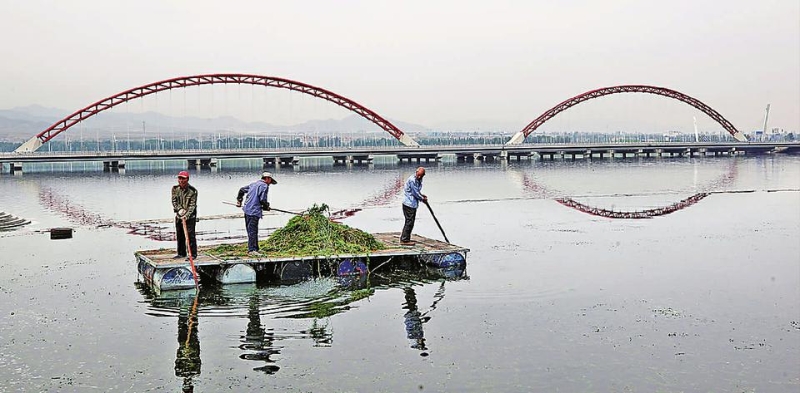 隨著氣溫升高,清水河內(nèi)的水草開(kāi)始 “瘋長(zhǎng)”,不但會(huì)影響汛期排澇,而且污染水質(zhì)。連日來(lái),張家口市清水河河務(wù)管理處組織工作人員清除水草, 確保河道行洪安全與美觀。圖為工作人員清除明湖河道水草。 陳飛攝影報(bào)道