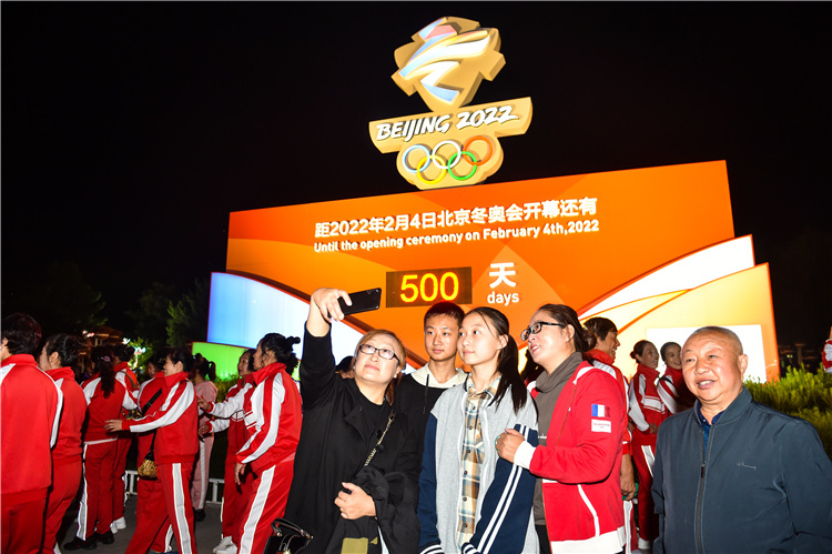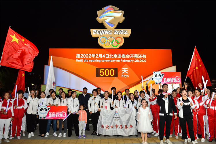 2020年9月21日,正值北京2022年冬奧會(huì)倒計(jì)時(shí)500天,張家口市冬奧辦的工作人員及市民在張家口市民廣場(chǎng)前的倒計(jì)時(shí)牌前慶賀。河北日?qǐng)?bào)記者耿輝攝