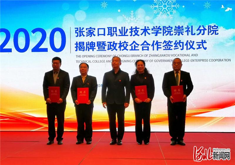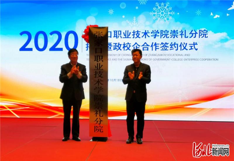 圖為張家口職業(yè)技術(shù)學(xué)院黨委書記馮印濤(左)與崇禮區(qū)區(qū)長(zhǎng)趙贊(右)共同為崇禮分院揭牌。河北日?qǐng)?bào)記者王雪威攝