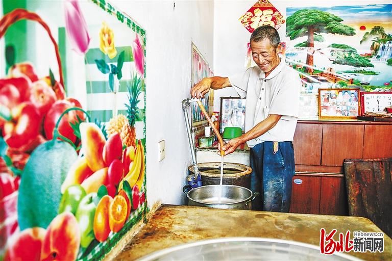 在張北縣郝家營(yíng)鄉(xiāng)三義美行政村東太平自然村,自來(lái)水入戶后,52歲的村民趙成發(fā)開(kāi)心地取水做飯。(河北日?qǐng)?bào)資料片) 通訊員 李曉寧攝