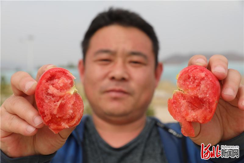 圖為來訪者展示在河北省張家口市橋東區(qū)大倉蓋鎮(zhèn)雙廟村蔬菜大棚內(nèi)采摘的西紅柿。