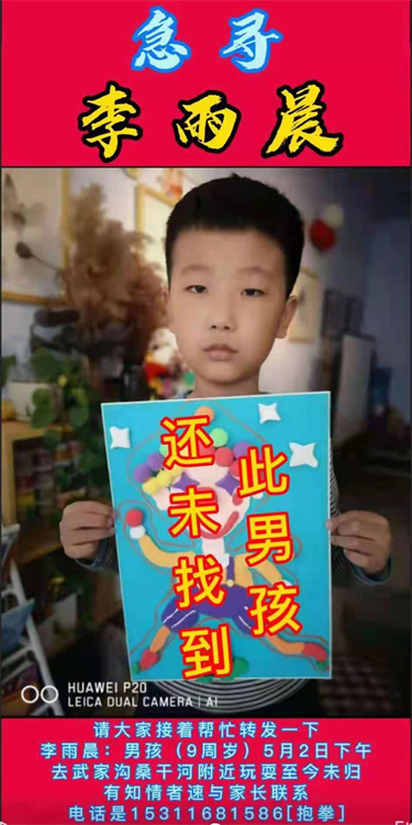 王亞如介紹,她的兒子李雨晨,今年9歲,是張家口涿鹿縣東興小學(xué)二年級學(xué)生,5月2日下午兩點左右,李雨晨和家人到涿鹿縣武家溝鎮(zhèn)牛家窯村桑干河附近游玩,“孩子吃完飯后,找他爸要手機玩,他爸沒有給,說了他兩句,可能不高興了。”王亞如說,后來李雨晨和另外兩個孩子去玩打水仗,”那兩個孩子水槍里沒水了,就到河邊去接水,李雨晨在岸上等著,沒下去,兩個孩子接滿水槍后回來發(fā)現(xiàn)李雨晨不見了!彪S后,李雨晨的父親和朋友沿著桑干河水岸走了2公里,后又開車找了8公里左右,都沒有找到孩子。