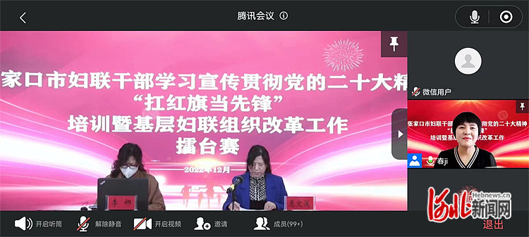 河北網(wǎng)訊(通訊員劉雁霞 河北日?qǐng)?bào)記者劉雅靜)為深入學(xué)習(xí)宣傳貫徹黨的二十大精神,12月26日—28日,張家口市婦聯(lián)利用三天時(shí)間在線上舉辦了全市婦聯(lián)干部學(xué)習(xí)宣傳貫徹黨的二十大精神“扛紅旗 當(dāng)先鋒”培訓(xùn)暨基層?jì)D聯(lián)組織改革工作擂臺(tái)賽。全市、縣、鄉(xiāng)、村四級(jí)婦聯(lián),“四新”領(lǐng)域婦聯(lián)主席,專兼掛職副主席、婦聯(lián)干部、婦聯(lián)執(zhí)委等,共計(jì)3000余人參加了此次培訓(xùn)。