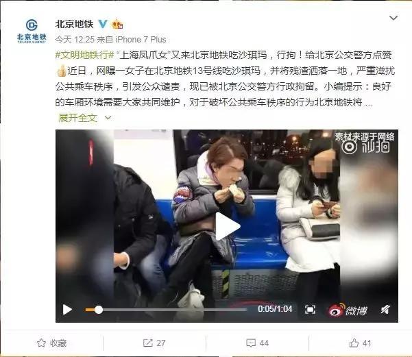 近日,上!暗罔F鳳爪女”在北京地鐵13號(hào)線上吃沙琪瑪,將食物殘?jiān)袈湟坏氐氖聝呼[得沸沸揚(yáng)揚(yáng)。但這次,她卻沒能像在上海那般“幸運(yùn)”。