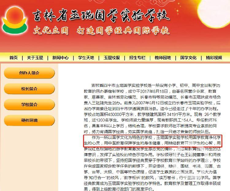 玉琨學(xué)校網(wǎng)站簡介顯示,該校以國學(xué)文化為特色,用中醫(yī)教育保障學(xué)生身體健康,用辯經(jīng)教育開發(fā)學(xué)生的心智。圖片來源:網(wǎng)頁截屏