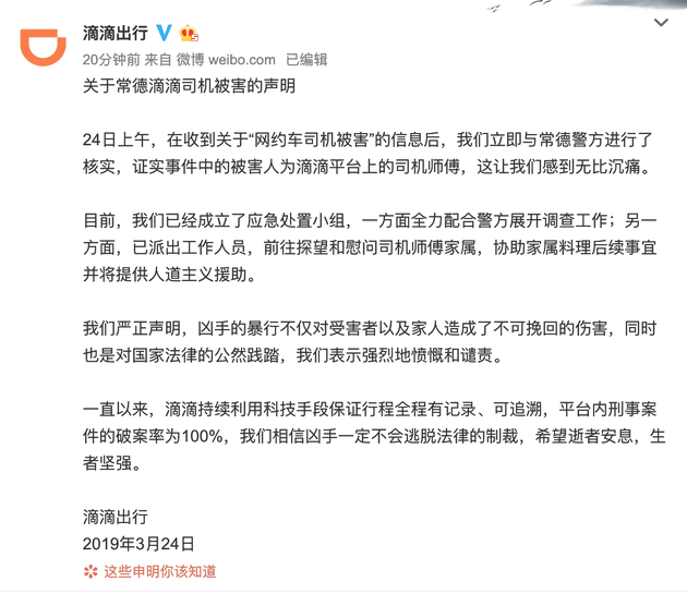 據(jù)鼎城警事微博通報(bào),2019年3月24日凌晨,常德市江南城區(qū)發(fā)生一起命案,一名網(wǎng)約車司機(jī)被害身亡。經(jīng)警方核實(shí),事件中的被害人為滴滴平臺上的司機(jī)師傅。事發(fā)時(shí),坐在后排的楊某淇乘司機(jī)陳某不備,朝陳某連捅數(shù)刀,致陳某死亡。據(jù)楊某淇供述,其因悲觀厭世早有輕生念頭,當(dāng)晚因精神崩潰無故將司機(jī)陳某殺害。