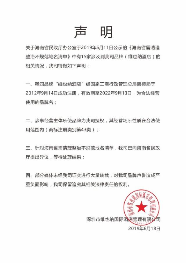 國(guó)家六部委《關(guān)于進(jìn)一步清理整治不規(guī)范地名的通知》指出,“工作原則是審慎穩(wěn)妥、依法實(shí)施”!熬S也納酒店”既然是深圳維也納酒店集團(tuán)在原國(guó)家工商總局注冊(cè)的合法商標(biāo),海南相關(guān)企業(yè)根據(jù)授權(quán)使用這一商標(biāo)與品牌,其權(quán)利應(yīng)當(dāng)?shù)玫接嘘P(guān)部門(mén)尊重。