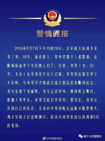 據(jù)媒體報道,8月7日,江蘇睢寧一外賣員疑因送餐遲到幾分鐘被一女子追打謾罵,女子拿起板凳猛砸,外賣員沒有還手。據(jù)悉,該外賣員18歲,是暑期工,對路況不熟悉,因反復與女子溝通送餐地點產(chǎn)生不快。如今該女子受到了行拘5日的處罰,平臺也將上門安慰騎手并給予“委屈獎”。