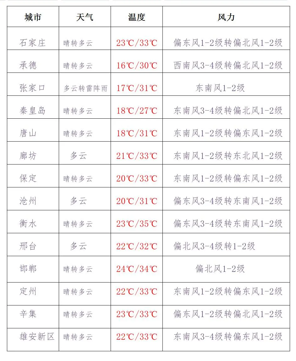 今天下午到夜間,張家口、承德中西部、保定西北部和石家莊、邢臺、邯鄲三個地區(qū)的西部晴轉(zhuǎn)陰有分散性陣雨,其他地區(qū)晴間多云。