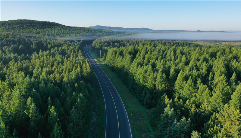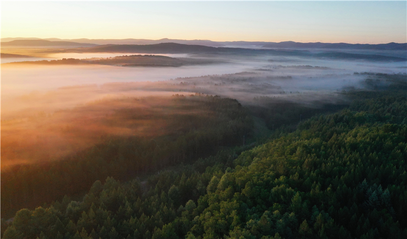 6月27日拍攝的塞罕壩國家森林公園晨景(無人機(jī)照片)。