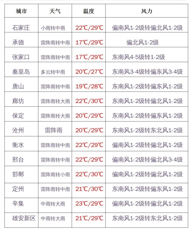明天夜間到3日,全省陰有雷陣雨或陣雨,其中張家口東部、承德、唐山、秦皇島、保定東部、雄安新區(qū)、廊坊、石家莊東部、滄州、衡水、邢臺(tái)有中到大雨,局地有暴雨。