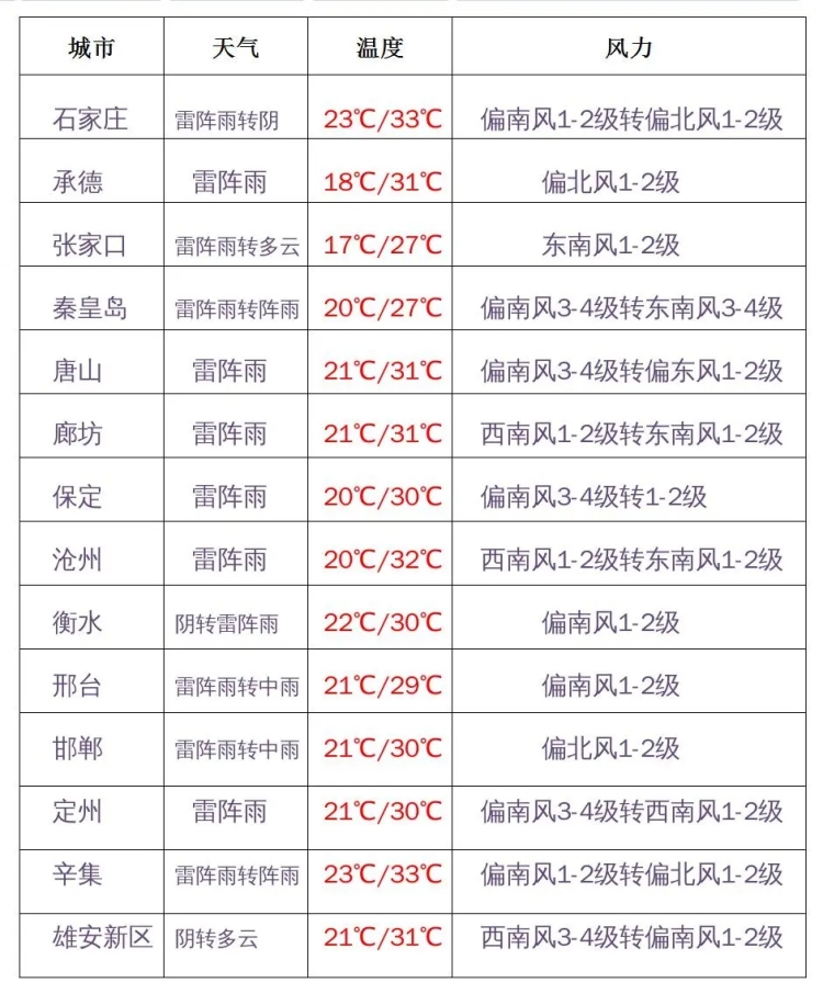 今天下午到夜間,全省多云間陰,大部分地區(qū)有雷陣雨或陣雨,其中承德南部、唐山、保定東部、雄安新區(qū)、廊坊、石家莊東部、滄州、衡水局地有中到大雨,個(gè)別地點(diǎn)有暴雨,雷雨時(shí)局地伴有短時(shí)強(qiáng)降水、短時(shí)大風(fēng)、冰雹等強(qiáng)對流天氣。