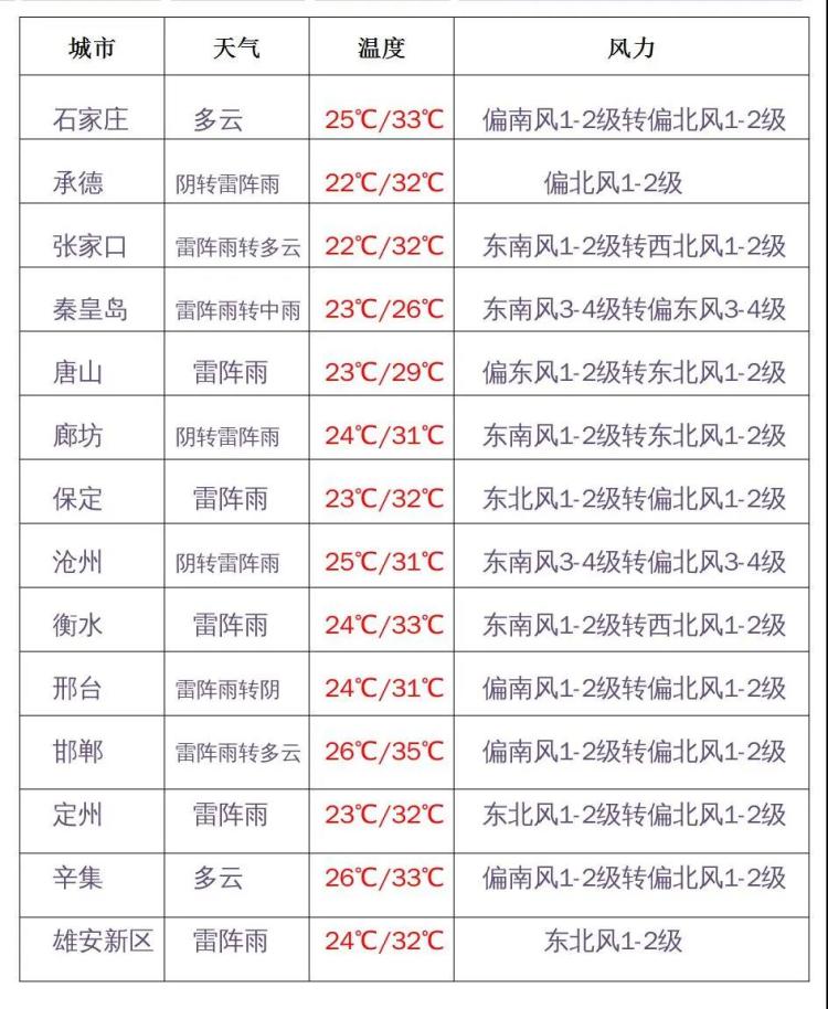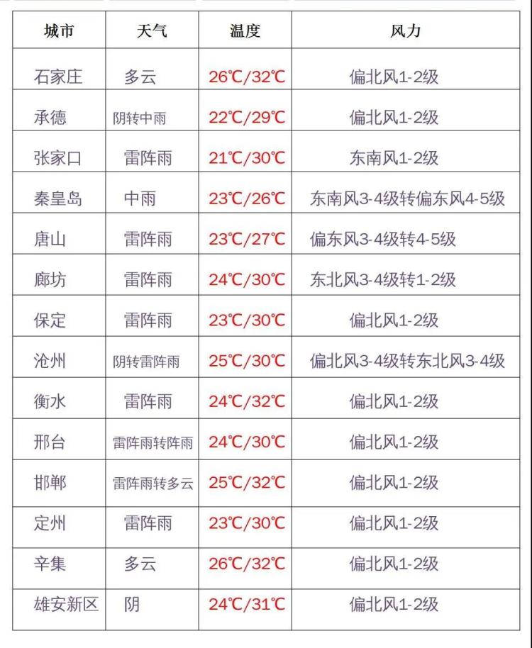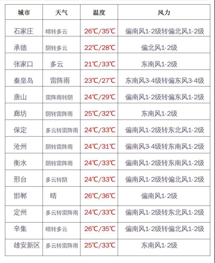 7月14日白天,張家口、承德、保定北部多云轉(zhuǎn)陰有雷陣雨,唐山、秦皇島、滄州東部多云間陰有分散性雷陣雨,其他地區(qū)多云。