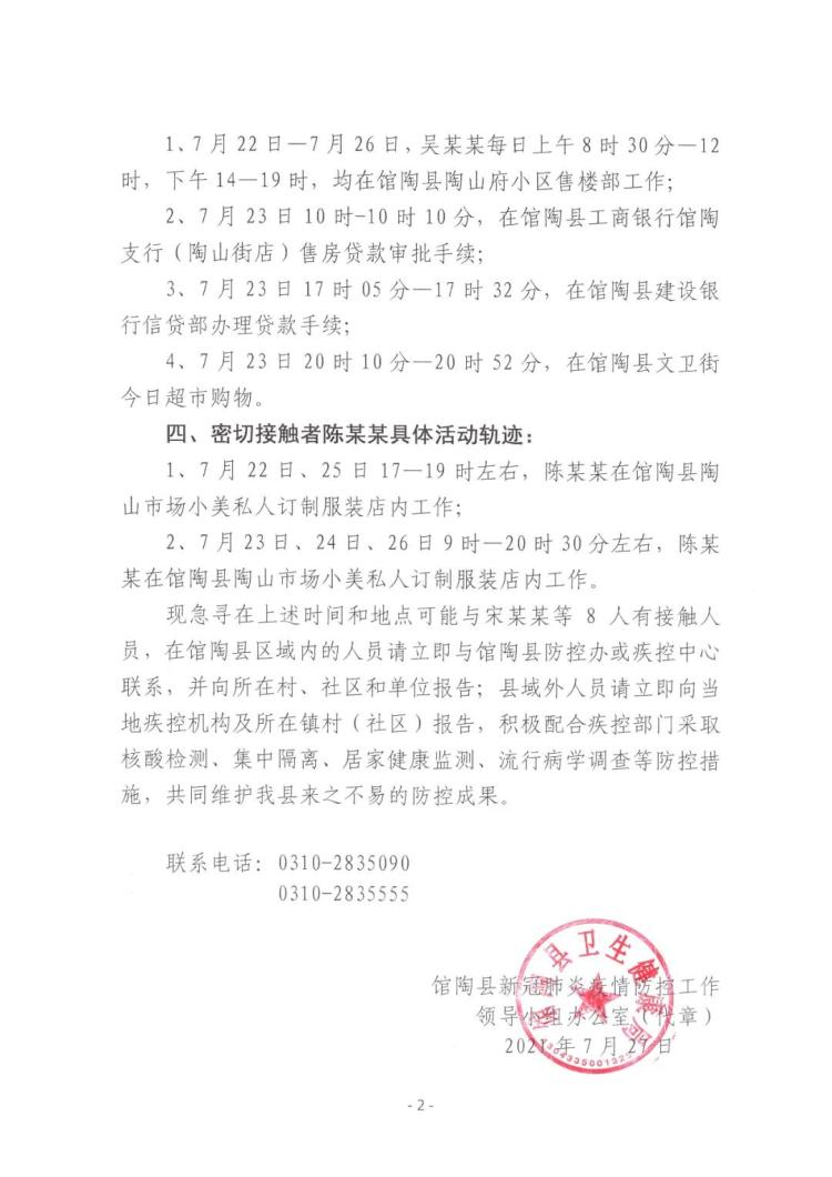 現(xiàn)急尋在上述時(shí)間和地點(diǎn)可能與宋某某等8人有接觸人員,在館陶縣區(qū)域內(nèi)的人員請(qǐng)立即與館陶縣防控辦或疾控中心聯(lián)系,并向所在村、社區(qū)和單位報(bào)告;縣域外人員請(qǐng)立即向當(dāng)?shù)丶部貦C(jī)構(gòu)及所在鎮(zhèn)村(社區(qū))報(bào)告,積極配合疾控部門采取核酸檢測、集中隔離、居家健康監(jiān)測、流行病學(xué)調(diào)查等防控措施,共同維護(hù)我縣來之不易的防控成果。聯(lián)系電話:0310-2835090;0310-2835555。