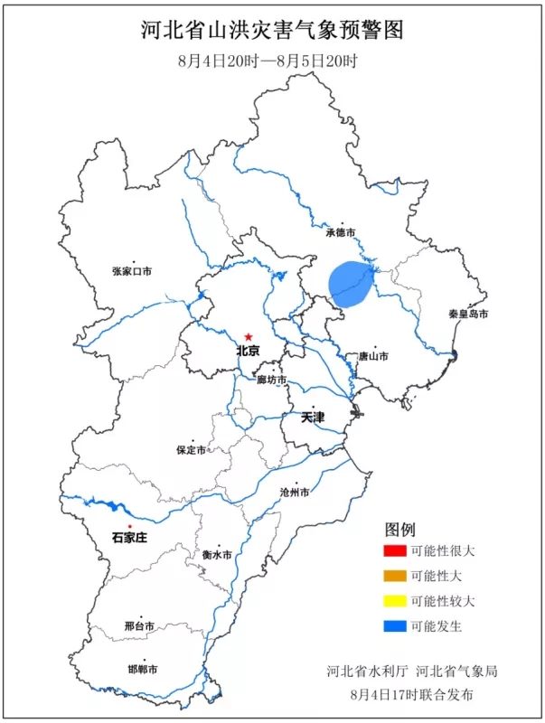 預(yù)計,8月4日20時至8月5日20時,唐山市(遵化市、遷西縣)、承德市(興隆縣、寬城滿族自治縣)等地局地可能發(fā)生山洪災(zāi)害(藍色預(yù)警)。請上述地區(qū)注意做好實時監(jiān)測、防汛預(yù)警和轉(zhuǎn)移避險等防范工作。