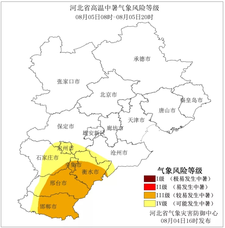 河北省氣象災(zāi)害防御中心2021年08月04日16時發(fā)布中暑氣象風(fēng)險等級預(yù)報: