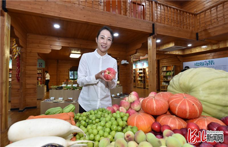 8月24日,大貴口村第一書記郝天嬌在山谷市集向記者講述習近平總書記到展廳考察時的情景。河北日報記者 趙海江攝
