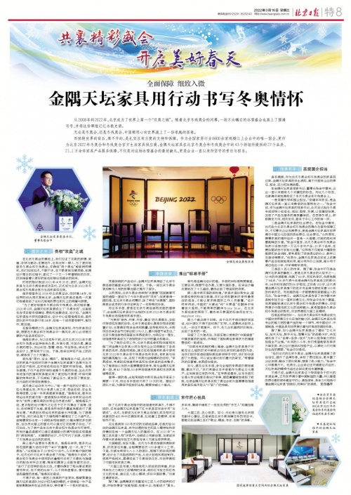 這樣的一套“綠色”組合拳,高效實(shí)踐了“綠色、節(jié)儉”辦奧運(yùn),對(duì)此,在金隅天壇家具黨委書記、董事長(zhǎng)張金中結(jié)認(rèn)為,企業(yè)擔(dān)當(dāng)與責(zé)任十分重要。無論是向世界展示中國制造的品質(zhì)與實(shí)力,還是賽后家具循環(huán)經(jīng)濟(jì),都是國有企業(yè)的責(zé)任、擔(dān)當(dāng)、實(shí)力和發(fā)展戰(zhàn)略。“經(jīng)歷這次的北京冬奧會(huì),金隅天壇家具提高了政治站位,提升了品牌形象,體現(xiàn)了責(zé)任擔(dān)當(dāng),更豐富了企業(yè)資源,融洽了團(tuán)隊(duì)氛圍,增強(qiáng)了戰(zhàn)斗能力。”張金中心中感慨萬千。他表示,企業(yè)將記住并感謝這次經(jīng)歷,天壇家具的精神內(nèi)涵也會(huì)因此更加豐富厚重。
