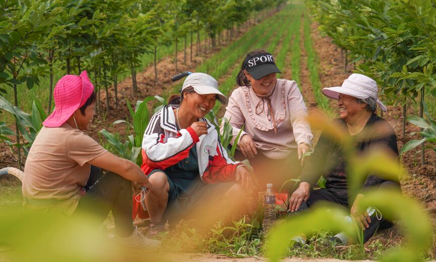 6月11日,河北省遵化市新店子鎮(zhèn)西葦?shù)甏鍘酌碌馗苫畹膵D女在地頭歇息嘮家常。  新華社發(fā)(劉滿(mǎn)倉(cāng)攝)