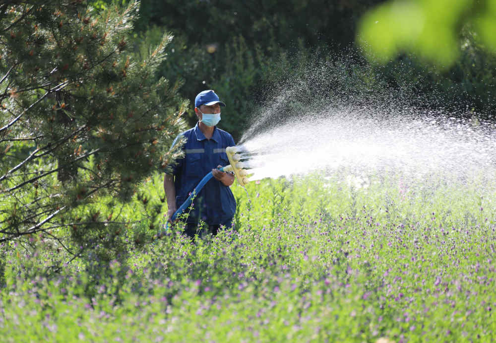 6月2日,在固安縣濱河生態(tài)運(yùn)動公園,園林工人進(jìn)行噴淋作業(yè)。(門叢碩 攝)