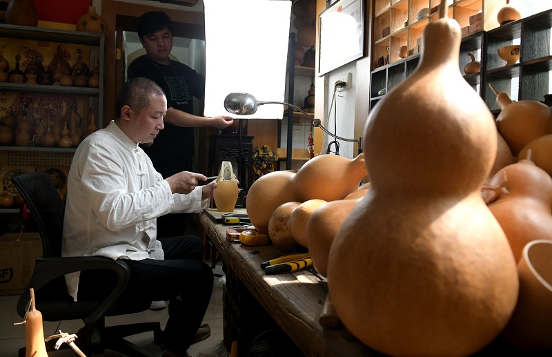 6月18日,民間藝人曹磊在石家莊市新華區(qū)工作室進行葫蘆傳統(tǒng)器具創(chuàng)作。新華社發(fā)(陳其保 攝)