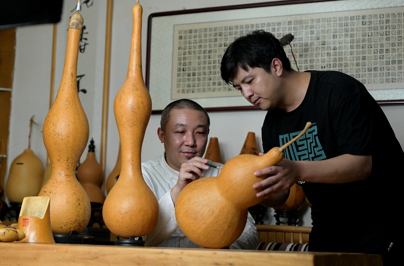 6月18日,民間藝人曹磊(左)在石家莊市新華區(qū)工作室指導學員進行葫蘆傳統(tǒng)器具制作。新華社發(fā)(陳其保 攝)