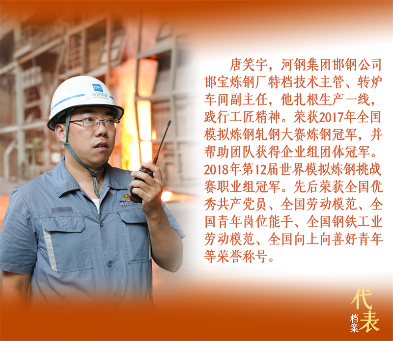 參加工作14年,唐笑宇堅持扎根一線,堅持實踐創(chuàng)新,先后榮獲全國優(yōu)秀共產(chǎn)黨員、全國勞動模范、全國青年崗位能手、全國鋼鐵工業(yè)勞動模范、全國向上向善好青年等榮譽稱號。今年,他被選為邯鄲市出席黨的二十大代表。