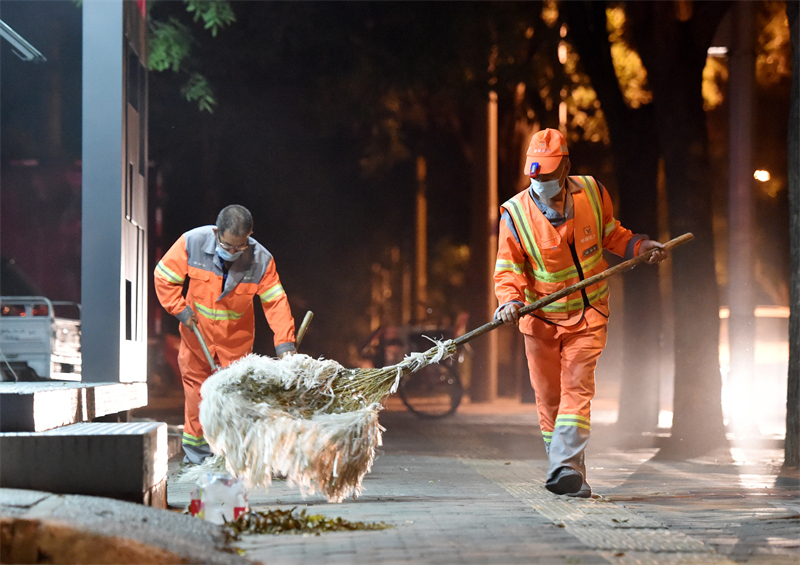 10月1日凌晨,河北省石家莊市橋西區(qū)環(huán)衛(wèi)工人清掃街道。