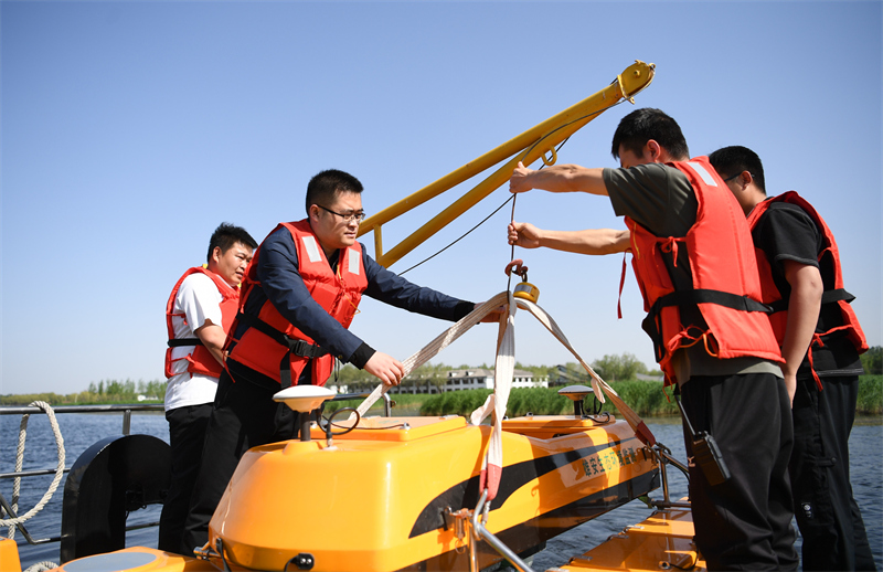 河北雄安新區(qū)生態(tài)環(huán)境局工作人員準備把水質無人監(jiān)測船下放至白洋淀水面(2022年4月26日攝)。 新華社記者 朱旭東 攝